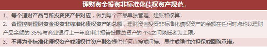 点评: 2013年3月银监会8号文已对理财资金投资非标资产作总量限制,即投资非标的部分不得超过理财总额35%及银行总资产4%。许多规定已经在8号文里提过,比如严禁资金池、要求资产一一对应等,这回又进一步强调,非标和资产池监管趋严,纠正理财业务回归资产管理业务的本质。