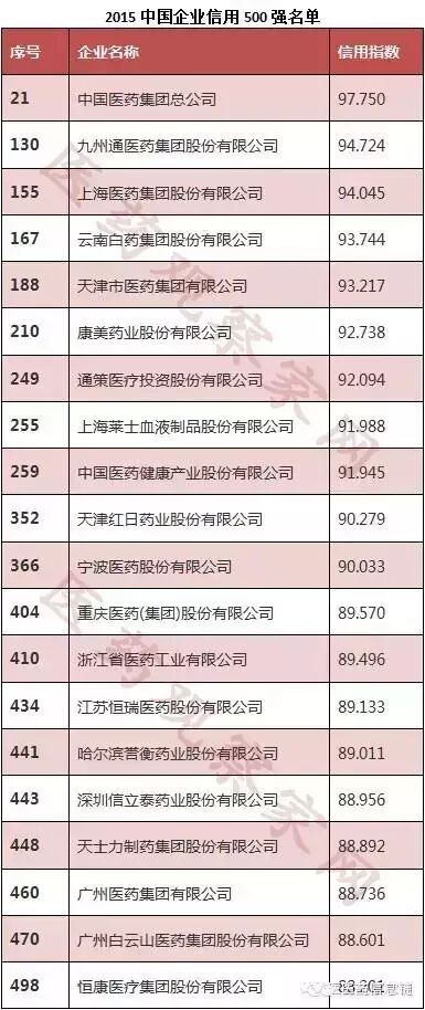 中国合作贸易企业协会、中国企业改革与发展研究会联合发布《中国企业信用发展报告2015》,其中20家药企上榜企业信用500强。