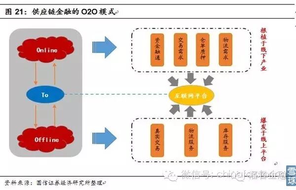 扎根于产业,供应链金融O2O生态更接地气。与传统金融机构相比,核心企业更易搭建供应链融资生态。在发展成熟阶段,供应链金融将在产品、物流、仓储、资金融通等多个维度建立起以核心企业为中心的生态系统,而互联网从消费到产业、从个人到企业的渗透加速了供应链金融生态的成型。与金融机构只做金融业务相比,供应链金融在产品业务端对上下游企业更具粘性,且相比于产品消费端的O2O模式更具产业根基。