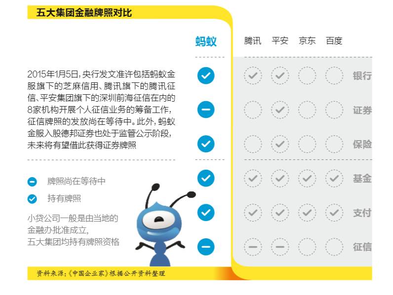 从2004年支付宝诞生算起,经过11年的发展,在互联网行业中,蚂蚁金服拥有的金融牌照最多:第三方支付、基金销售、小额信贷、银行、保险、证券、以及未来的个人征信牌照。这家公司的“用户量相当于四个招商银行”;这家公司的支付工具支付宝占据了中国移动支付8成市场份额;这家公司拥有全球第二大货币基金余额宝,其资金量相当于一家股份制城商行;这家公司还拥有全中国两张互联网银行牌照中的其中一张。