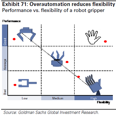 此外,高盛还指出,自动化并不是进度越快越好,自动化程度过高反而可能损害生产效率: