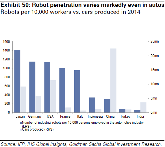 高盛今年3月份走访了中日26家工厂后,感叹中国新工厂自动化程度之高全球领先。但有先进范例的同时,也不能忽视中国目前整体自动化水平较低。该机构同时指出自动化并不是程度越高越好,自动化程度过高反而可能损害生产效率。