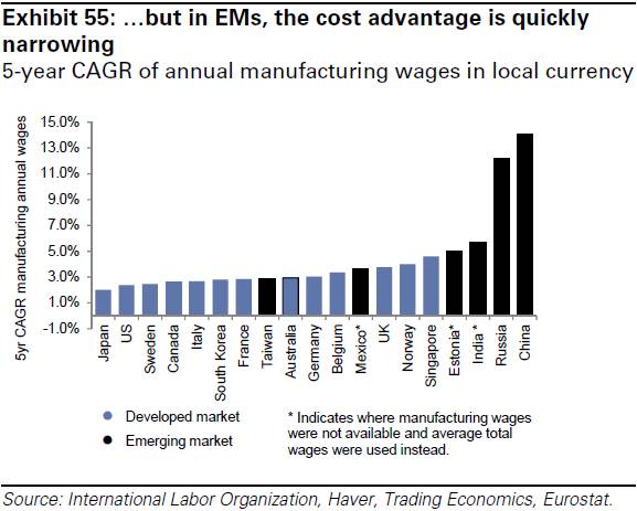 中国目前整体自动化程度较低,虽然劳工成本和发达国家比在缩窄,但现在仍显著低于发达国家,所以,对人工转向自动化的激励还比较弱。我们对中国企业的预算分析显示,其资本支出/营收比率还是要比成熟的发达国家制造型企业低的多。