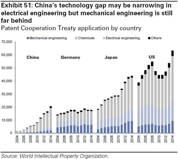 下图显示中国在电子工程行业与发达国家的差距在缩小,但机械工程方面的差距还落后较多: