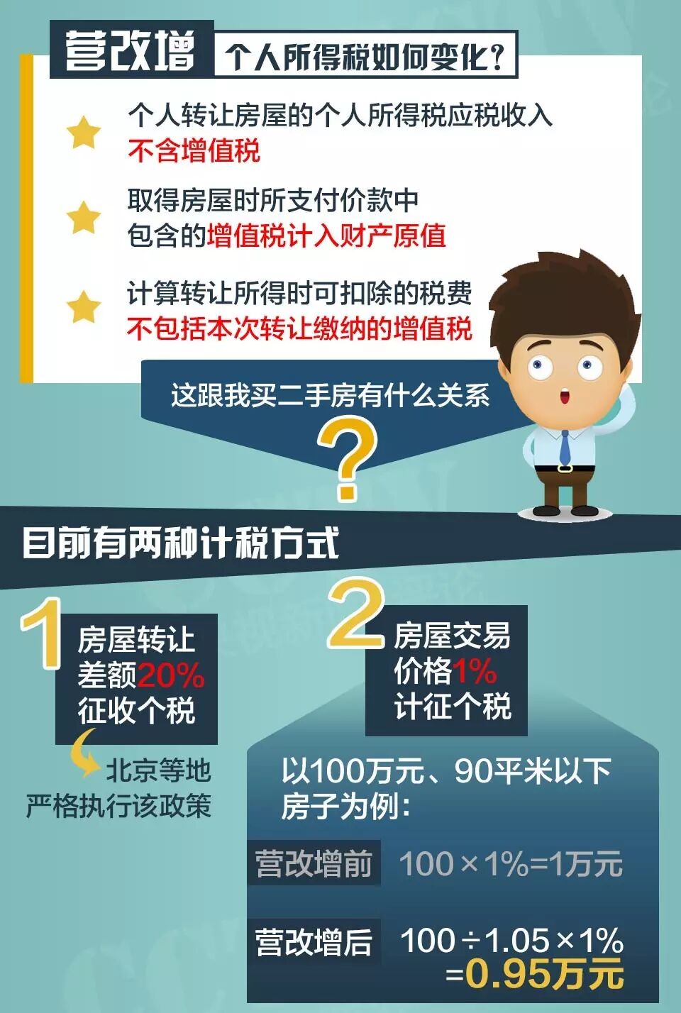 营改增后,个人二手房交易营业税改为增值税,同时契税和个税的计税依据也将发生调整。