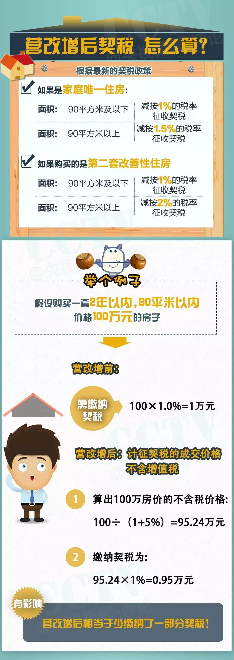 5月1日起,“营改增”试点工作将全面实施,首次涉及自然人缴纳增值税。财政部、国家税务总局日前发出通知,对营业税改征增值税后契税、房产税、土地增值税、个人所得税计税依据有关问题进行了明确。不少购房者心里犯起了嘀咕,买房的税负将增将减?哪些范围可以免征?怎样才会更省钱?一一为您解答。