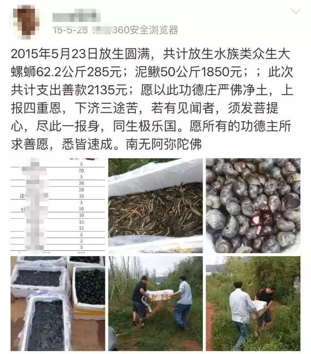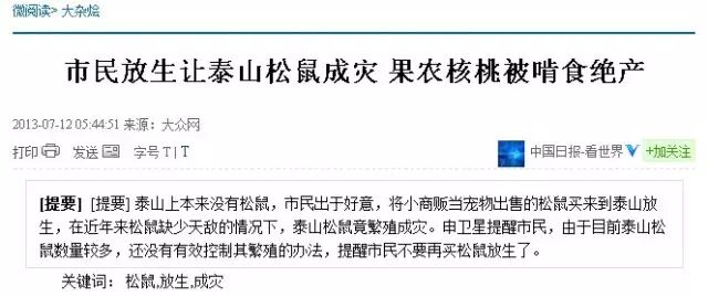 网上知名的科普作者@飞雪之灵 也告诉耿直哥,这位博主放生的福寿螺、克氏原螯虾、佛罗里达鳖,以及四大家鱼等物种,都会强势地侵占当地的淡水环境与生态资源,迫使云南土生土长的一些鱼类灭绝! 2011年的一篇新闻报道就已经指出,因为被外来的鲤鱼入侵,云南本地星云湖中独有的“纯种大头鲤”已经彻底灭绝,剩下的都是和鲤鱼杂交的混种了... 在另一篇来自于2011年的文章中,云南省的农业专家们也着急的指出,那位博主最爱“放生”的福寿螺(既平常我们用牙签挑着吃的那种大螺蛳),自从被人胡乱引入云南的生态系统后,对云南的水田危害,每年都会造成近5000万的损失! 而且福寿螺因为适应性和繁殖力都极强,还特别能吃能拉,更会严重污染淡水环境,逼死其他云南本地的物种,并传染多种疾病给人类。 当有人将一堆堆的福寿螺扔在云南的土地上时,仅在大理洱海一地,当地官方每年却要拿出20多万元的经费来善后…… 然而,像上述这种“放生”,还自以为积累了什么“功德”的人,却不在少数。 单从@博物杂志 在其微博上曝光的情况来看,除了有人放生过剧毒的毒蛇、性情残暴的外来食肉类物种鳄龟,甚至还有人曾经将一种非洲的蛤蟆“放生”到了中国的土地上,而这种蛤蟆不仅难以在中国的生态环境下存活,更可怕的是,其携带的一种病菌,能导致中国的蛙类患上严重的绝症! 2013年时,泰山还因为有大量的人从当地商贩那里购买松鼠在山里放生,导致缺乏天敌的松鼠大量繁殖,毁山灭林,更有山民辛苦种的上万只核桃树,被松鼠啃掉了一大半...最终当地官方不得不紧急呼吁大家不要再放生松鼠了... 还有,还记得咱们文章最开头说的那个“放生狐狸,结果村民家的鸡都遭殃”的故事吗?这也是真人真事,而且就发生在不久前的北京顺义区。有人居然在这里放生了300多只狐狸,结果村民家的鸡大量失踪和死亡。 你说这都是啥事?但令人哭笑不得的是,连这种荒唐事,也已经不是个案了! 同样是在几天前,有网友爆料说,前年曾有一群人,竟集资45万买下了700多条狐狸,并放生在青岛崂山风景区…… 事实上,这种做法与真正的佛教精神,相去甚远。在一些佛教网站上,也有佛教人士站出来批判过这些“放生教”教徒的偏执行为,认为他们“只是注重放生形式,却忽略了本意与实效”、并“夸大”了放生的“功德”。结果,他们的盲目放生不仅不能真正积累功德,反而越放生“慈悲心越薄越脆弱,功德也越放越小”…… 更值得警惕的是,如今“放生”俨然已经成为了一种“产业”:有商家从国外进口外来物种,然后利用一些人“求功德”的“功利心”,开高价出售这些物种;还有的商家则会将被放生的物种立刻捕捉回去,重新贩卖... 在知乎网上,一位名叫@王举人 的网友在评论“放生真的有那么高大上吗?”这个问题时,引用了电影《达摩祖师传》中的一句台词: “达摩见梁武帝,梁武帝自认为修建寺庙无数,应该是功德无量。达摩却说他毫无功德,梁武帝不悦,赶走达摩... 后来,在另一位高僧的指点下,梁武帝终于明白,原来自己是因贪图功德而建功德。贪图功德是恶,建立功德是善,一善一恶,相互抵消,自然是毫无功德。” 用世俗的话来说,这其实就是“自私”。而这也是当今社会普遍存在的一个问题:放生的人关心的并不是万物是否“和谐”,而仅仅是自己能不能获得功德。