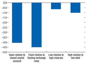 一个金融更为开放的国家在经济上行时会吸引到更多的资本,而当经济出现下行时,其资本流入同样会远低于金融相对封闭的国家的资本流入量。数据显示,当其他变量恒定时,资本账户开放程度高于平均水平的经济体比起低于平均水平的经济体,其资本流入减少现象更为严重,资本流入占GDP的比值相差4个百分点。同样的,在其他变量不变的情况下,外汇储备低于均值、公共债务占比GDP高于均值的经济体的资本流入水平分别较外储高于均值、公共债务比率低于均值的经济体损失更多的资本流入,比值差距分别为0.6个百分点、1个百分点。相较于浮动汇率国家,汇率制度欠灵活的经济体的资本流入占GDP比重多下降4.5个百分点。
