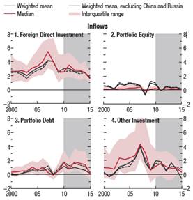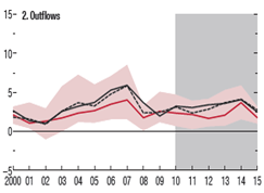 图2. 新兴市场经济体不同资产类别的流入、流出情况2000–15:Q3(%GDP)