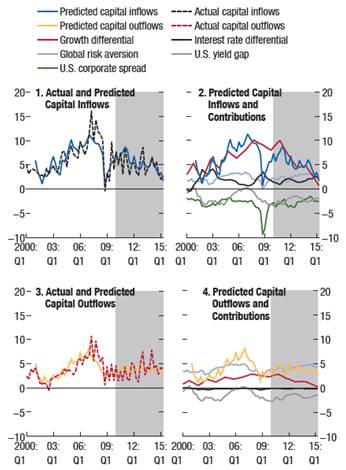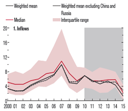 图1. 新兴市场经济体资本流入、资本流出情况(%GDP)2000-15:Q3
