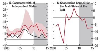 (3)危机后大部分地区都面临了净资本流入放缓的情况,然而值得注意的是,东欧资本净流出情况最为显著且持久,拉丁美洲与“其他新兴市场”则主要集中在2014-15年。资本主要由东亚,海湾合作委员会成员国及东欧地区流出,流入至拉丁美洲、独立国家联合体与“其他新兴市场”。