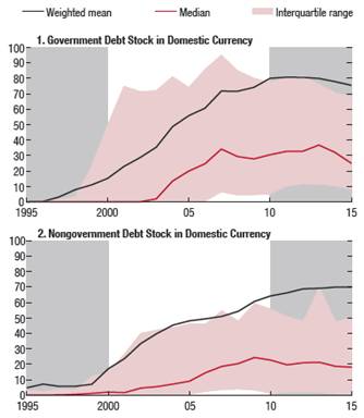 图8. 新兴市场经济体以本币计值的未偿还债务1995–2015 (%of total)