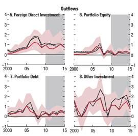 (1)资本流入的减少、流出的增加分别在2010-15年间某一时段扮演着重要的角色。如,流出增加是2012-14年净流入放缓的主要推手,而2011年的下跌则要归因于流入的减少。因此并不是某一单向资本流动导致了净资本流入的减少,而是两者共同影响的结果。即净资本流入的放缓既受到流入减少的影响,同时也归咎于流出的增加。