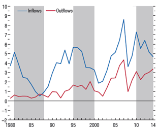 图6. 新兴市场经济体总资本流入、流出1980–2014 (% GDP)