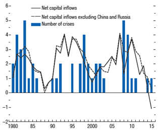 图4. 新兴市场经济体净资本流入、债务危机发生数量,1980–2015:Q3 (% GDP)