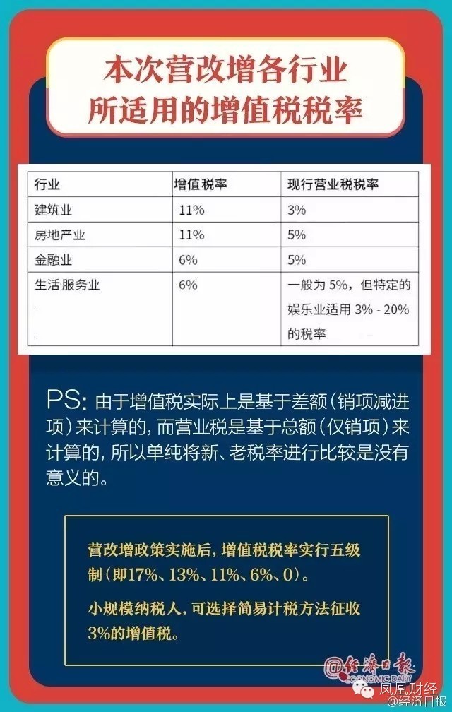 来源:凤凰财经综合、华尔街见闻,经济日报(ID:jjrbwx)5月1日起,营改增将全面铺开,试点范围扩大到建筑业、房地产业、金融业、生活服务业,四