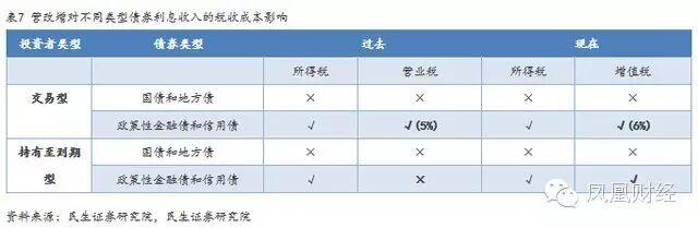 《营业税改征增值税试点实施办法》中规定,各种占用、拆借资金取得的收入,包括金融商品持有期间(含到期)利息(保本收益、报酬、资金占用费、补偿金等)收入、信用卡透支利息收入、买入返售金融商品利息收入、融资融券收取的利息收入,以及融资性售后回租、押汇、罚息、票据贴现、转贷等业务取得的利息及利息性质的收入,按照贷款服务缴纳增值税。也就是说,现在政策性金融债和信用债持有至到期,均需缴纳增值税,增加了债券持有至到期的成本。