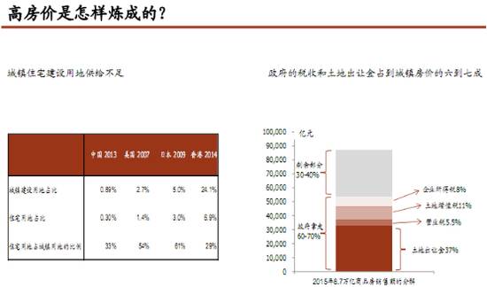 这是一个表。城镇住宅用地占国土面积和城镇建设用地占国土的面积。中国的数字无论是跟美国、日本比,还是跟香港比,我们都低的可怜。在过去十几年地方政府招商引资,提供了大量便宜或者低价的工业用地和商业用地的,最后挤的住宅用地很少。