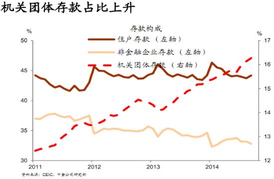 这几年,住户存款上升的速度和比例变化不大,金融企业有些下降,企业盈利不好,现金流偏紧。但是机关团体的存款一路上涨,去年上涨了15%,而民意GDP的增长速度只有6%,财政收入增长也只有6%-7%。那么,机关团体的存款以15%的速度继续增长,原因是什么?我们发现,这个数据在央行报表里叫机关团体存款,有二十几万亿。具体分项是什么,我们不知道。能够知道的是,这里面有“五险一金”,还有一些事业单位的存款。肯定不是企业的,居民的也不在这里。