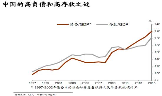 再看看高负债和高存款。中国的债务占GDP的比例250%、280%,这是世界最高,我觉得这个话是对的。但是有没有想过,债务对外一定是有资产的,大家担心债务比例高,如果我们用这个债务去支撑其它资产的购买,不管是房地产还是去年拿股票,后面资产一减值这边就出现很大问题。在其他所有国家里面,这都是不用问的假设,负债这边的资产一定是流动性差,期限是错配的,只是从来没有看到中国直接对面是现金吧。