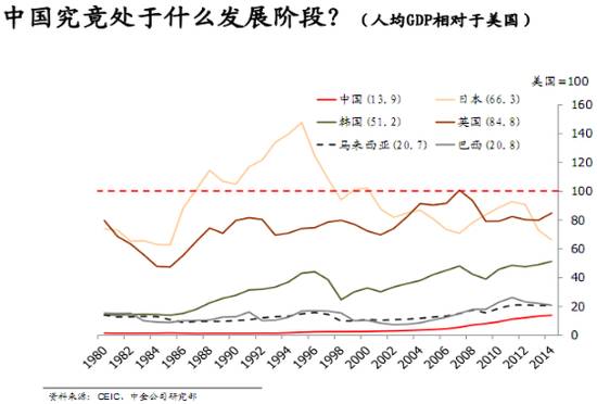 我们来看什么是发达国家,什么是中等收入国家,什么是发展中国家。在亚洲进入第一世界的国家是日本和新加坡,我们的香港接近,大概在70%、80%或100%,要看汇率的高低。第二世界是韩国和中国的台湾地区,大概在40%到50%。我们认为自己是中等收入,应该是在20%到30%。中国今天的人均收入水平和泰国差不多,在七、八千美金左右。