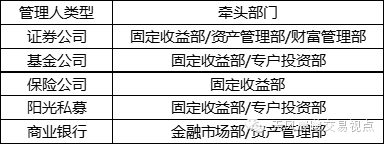 目前,委外市场的管理人以证券公司、基金公司、保险公司和阳光私募为主,部分银行亦以管理人的身份出现在委外市场。由于委外业务基本以货币类资产及债券类资产作为主要投资方向,各家管理人也通过类固收部门承接委外业务。
