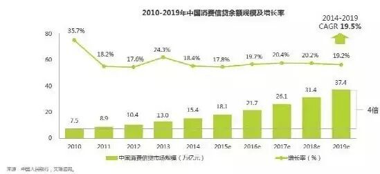 近年来,伴随着我国经济转型对刺激消费、扩大内需进而调整经济发展结构的迫切需求,以及居民收入和消费能力的提升,我国消费金融市场取得了快速的发展。数据显示,2014年中国消费信贷规模达到15.4万亿,同比增长18.4%,依然处于快速发展阶段。预计2014-2019年中国消费信贷规模依然将维持19.5%的复合增长率,预计2019年将达到37.4万亿,是2010年的5倍。