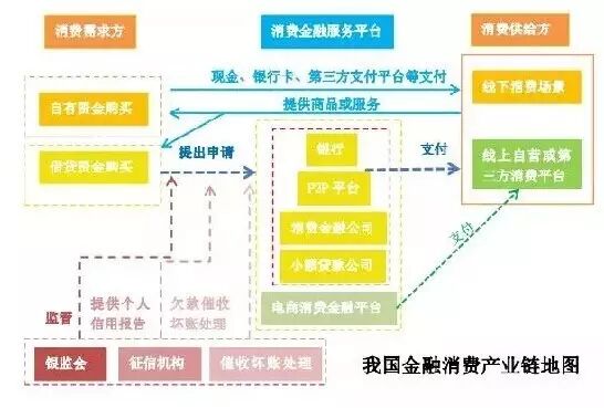 完整的消费金融产业链如下图所示,包括上游的消费需求方,核心的消费金融圈(消费金融服务平台和监管机构)以及下游的消费供给方。