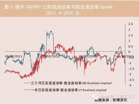 这个阶段市场波动较小,客户倾向于卖出波动率获得收益,银行盘面显示正Gamma正Vega。由于流动性受限,银行会员通常无法直接完全背对背平盘,而采取滚动卖出短期期权来获利。在USDCNY长期实际波动率偏低的情况下,承担时间价值衰减(Time Decay)是极其痛苦的事情,所以期限错配的对冲方法被普遍接受和运用。比较2015年8月之前3个月和1年期限美元对人民币已实现波动率与隐含波动率的差值后不难看出,由于汇率波动较小,已实现波动率长期低于隐含波动率,差额在1%的水平。换言之,买入波动率的一方很难从市场汇率波动中通过动态对冲(Delta Hedge)获得盈利,所以银行会尽量保持期权头寸整体时间价值Theta为零或正值。