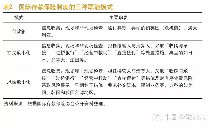 根据国际存款保险协会(IADI)划分,存款保险主要包括三种模式:一是“付款箱”,仅负责事后偿付存款人,如澳大利亚和此次危机前的英国;二是“损失最小化”,存款保险还具有风险监测和处置功能,能够实现存款保险基金损失最小化,如日本、加拿大、法国等;三是“风险最小化”,存款保险进一步具有早期纠正和补充监管职能,能够采取有效的风险预防和控制措施,实现风险最小化,如美国、韩国和我国台湾地区。