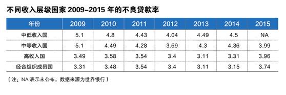 目前国际上公认的关于不良贷款率的警戒线是10%,而国际正常水平是在5%以下。世界银行数据显示,2009年全球金融危机以来,高收入国家的平均不良贷款率处于3.5%左右,中等收入国家的不良贷款率平均值在4.3%左右,中低收入国家在4.6左右。而根据银监会数据,我国2015年银行业不良贷款率均值为1.67,虽然较上年大幅提高42个基点,但绝对值仍处于世界较低水平。有意思的是,2015年并非只有中国遭遇了不良率上升的局面,世界银行公布的高收入国家和经合组织成员国(两者有交集)的不良贷款率均值也分别大幅上涨了65和59基点,至3.96%和3.74%的近年高位。