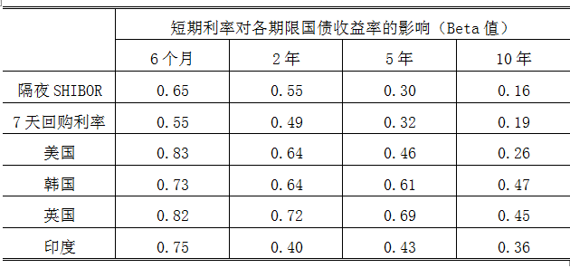 首先,我们对包括中国在内的五个国家的国债收益率对短期利率变化的敏感性(Beta)进行了估算。主要结论是:首先,我国短期利率变化会对各期限国债收益率产生显著影响,且长短期国债对基准利率的敏感性不同,短期利率变化对各期限国债收益率变化的传导效果随着期限的延长而减弱。这个特点与其他国家相同。其次,与其他国家(美国、韩国、英国和印度)相比,我国短期利率变化对中长期收益率的影响程度弱于其他国家。与其他四国的平均值相比,我国各期限的Beta平均值(国债收益率对短期利率的敏感性)约低30%。