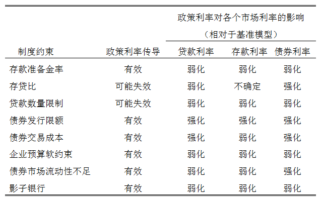 第三章对基准静态模型进行扩展,得出了存贷比、对贷款规模的数量限制、高存款准备金率、软预算约束、影子银行套利、债券市场流动性不足等都会制约利率传导效率的结论。