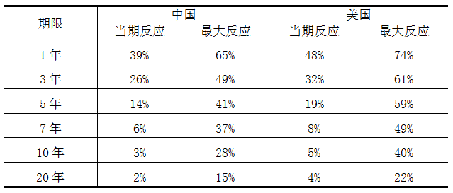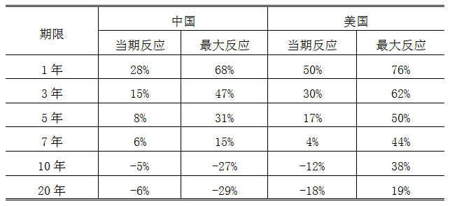表1-4 各期限收益率对短期利率变动的脉冲响应:中国与美国的比较