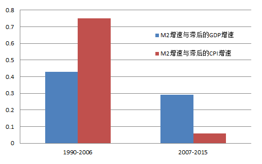 我们的估算表明,在1990-2006年间,M2增速与名义GDP增速的相关性(滞后一年)为0.43,在2007-2015年间该相关系数下降至0.29;类似地,在1990-2006年间,M2增速与CPI增速的相关性(滞后一年)为0.75,而2007-2015年间该相关性降低为0.06。这些相关性的下降,使得M2继续作为货币政策主要中介目标的合理性受到挑战。