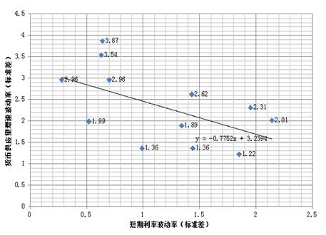 Walsh(2010)构建了一个包括新凯恩斯菲利普斯曲线(New Keynesian Phillips Curve)、前瞻性IS曲线(Forward-looking IS Curve)和货币需求曲线(Money Demand Curve)的一般均衡模型,结果表明,在存在多种需求扰动因素的情况下,越是试图盯紧货币供应量,越难以实现货币政策的最终目标。换句话说,在货币需求不稳定的转型时期下,将货币供应量的增速维持在一个固定的水平,会人为地造成市场利率的大幅波动,而利率大幅波动会导致经济的过度波动。这是因为,市场利率是货币需求和供给的均衡结果,如果固定了货币供给,但货币需求在变化,利率就会波动。我们用12个国家在各自货币政策框架转型期间的数据所做的跨国实证研究也表明,在货币政策框架转型过程中,一国的货币供应量增速越稳定,该国短期利率的波动就越大(见图1-1)。过高的利率波动使得融资者(包括企业和按揭消费者等)难以预测投资收益和成本,从而会产生抑制投资和消费的作用,有的市场参与者甚至会为了避险而产生囤积流动性的倾向,从而进一步加大了利率波动。