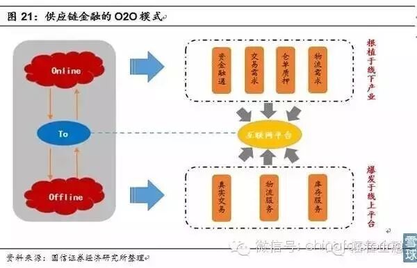 扎根于产业,供应链金融O2O生态更接地气。与传统金融机构相比,核心企业更易搭建供应链融资生态。在发展成熟阶段,供应链金融将在产品、物流、仓储、资金融通等多个维度建立起以核心企业为中心的生态系统,而互联网从消费到产业、从个人到企业的渗透加速了供应链金融生态的成型。与金融机构只做金融业务相比,供应链金融在产品业务端对上下游企业更具粘性,且相比于产品消费端的O2O模式更具产业根基。