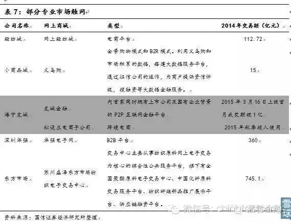 转型路径逐步清晰:互联网化与供应链金融。专业市场受到冲击后,转型方向主要有两个维度,一是顺应电子商务大潮对专业市场进行改造升级,将传统线下业务搬至网上;二是依托供应链金融服务寻求支撑,专业市场掌握大量优质商户资源,以商户为中心,服务上下游融资、物流等需求,将打开转型空间。