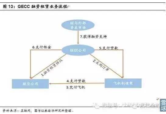 大型设备融资租赁为基础的供应链金融模式。飞机融资租赁业务是GEC供应链金融崛起的关键因素,飞机单价高、使用期限长,天然适合做融资租赁,GEC通过 融资租赁服务促进厂商飞机设备的销售。首先,GEC与航空公司签署融资租赁协议,由GEC直接向飞机制造商下订单、付款采购飞机。飞机交由航空公司后,航 空公司按期支付本金以及相应利息给GEC。
