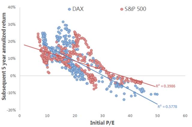 在3-7年的投资期限里面,估值的均值回归特性会充分的展现,解释大部分资产价格变动,这是价值投资者的期限。图4可见,美股和欧股初始投资的市盈率很大程度就决定未来5年的投资回报率。