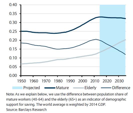 图3:全球人口结构展望,老龄化继续,但中年人占比下滑