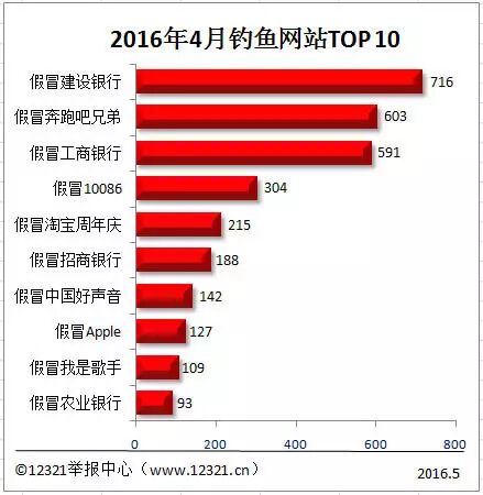 根据12321网络不良与垃圾信息举报受理中心接到网民举报的短信、邮件、网站等信息,2016年4月,12321举报中心收到钓鱼网站前十名如下: