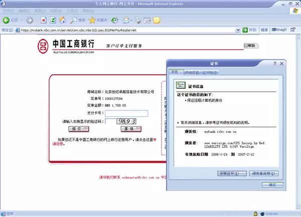 我行个人网上银行登录页面和网上支付页面都经过128位SSL加密处理,在打开上述页面时,在IE浏览器状态栏上会显示一个“挂锁”图形的安全证书标识。如客户浏览器为IE7,在客户进入工商银行个人网上银行登录页面和网上支付页面时,IE浏览器地址栏颜色还会为绿色。