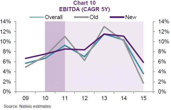 3,另一方面,企业的利润增速近两年来快速放缓,以EBITDA(未计利息、税项、折旧及摊销前的利润)为标准,旧部门的利润增速下滑地更剧烈,增速只有新部门的三分之一,这令旧部门更加难以偿还债务。