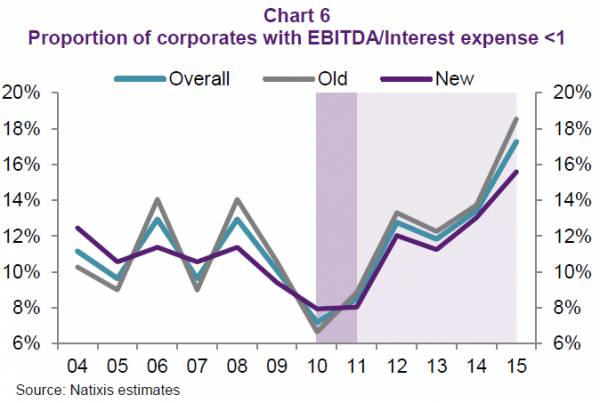 4,利润恶化导致企业偿付能力被削弱,现金流无法覆盖利息开支的企业数量从2010年的约8%提高到18%,同样旧部门的情况要比新部门更严重。这意味着很多企业只能借款度日。