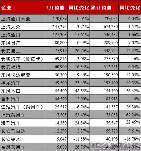 还有一个值得注意的企业就是上汽通用五菱,受益宝骏品牌的快速发展,其销量一直保持较理想的增长,而4月之所以微增长,相关分析表示,这是因为其微型商用车销量低迷,五菱品牌4月销量同比减少14%至98,580辆。