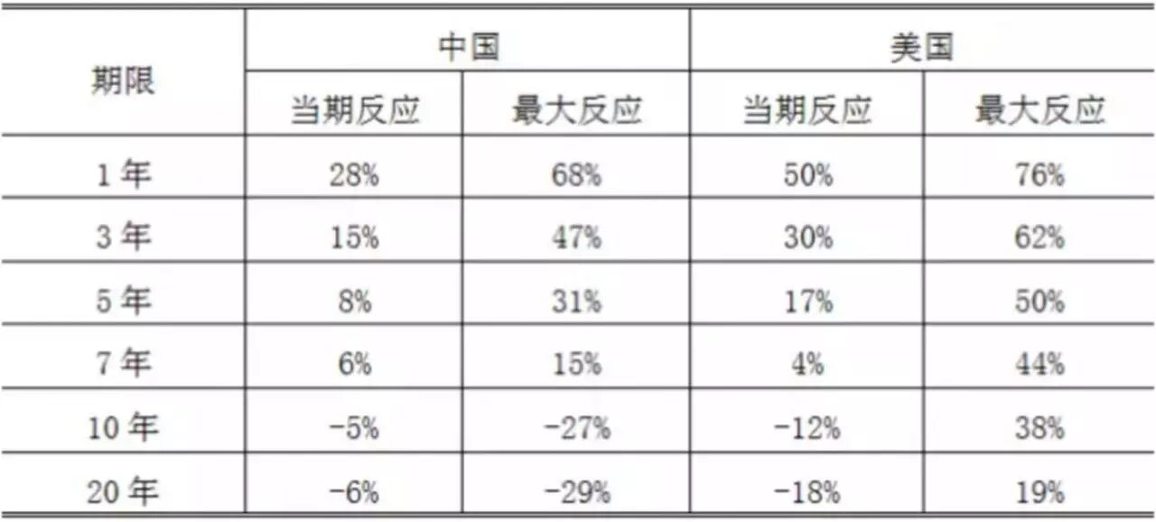表4 各期限收益率对短期利率变动的脉冲响应:中国与美国的比较(2002-2015年)