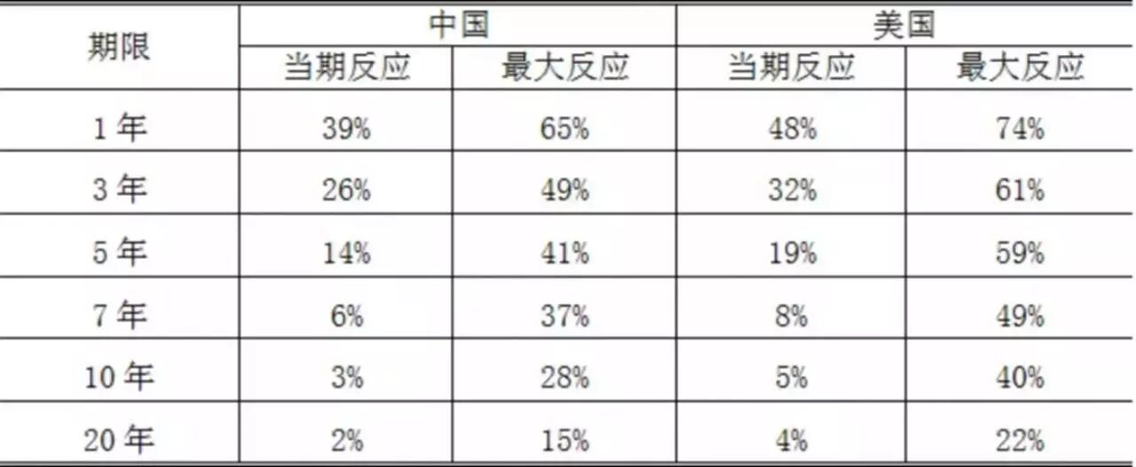 总体来看,我国短期利率对各期限债券收益率的传导是有效的,但其传导效果相比美国较弱。根据近五年的数据,各期限的最大反应与美国的相应数据相比,我国债券收益率对短期利率变化的平均反应能力约为美国的77%。