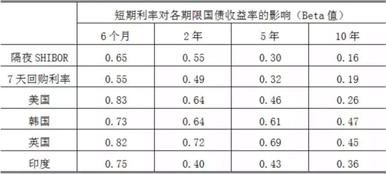 首先,我们对包括中国在内的五个国家的国债收益率对短期利率变化的敏感性(Beta)进行了估算。主要结论是:首先,我国短期利率变化会对各期限国债收益率产生显著影响,且长短期国债对基准利率的敏感性不同,短期利率变化对各期限国债收益率变化的传导效果随着期限的延长而减弱。这个特点与其他国家相同。其次,与其他国家(美国、韩国、英国和印度)相比,我国短期利率变化对中长期收益率的影响程度弱于其他国家。与其他四国的平均值相比,我国各期限的Beta平均值(国债收益率对短期利率的敏感性)约低30%。