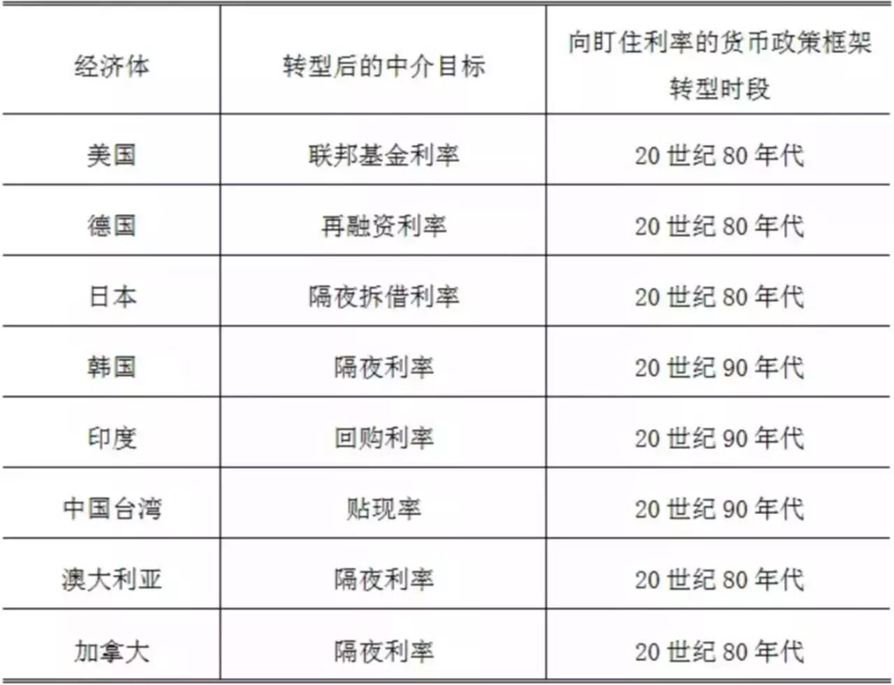中央银行的核心职能之一在于通过使用货币政策工具影响货币供应量或政策利率,使之接近中介目标,并通过货币政策传导机制进一步影响经济变量,以期达到货币政策的最终目标(如稳定物价、充分就业、经济增长等)。货币政策中介目标的不同(到底是货币供应量目标还是利率目标)是区分不同类型货币政策框架的关键之一。从近几十年来发达国家与多数中等收入国家货币政策框架转型的经验来看,主要是由于货币供应量与实体经济相关性的严重弱化,使得这些国家的中央银行放弃了以货币供应量作为中介目标,转向以政策利率作为中介目标(见表1)。
